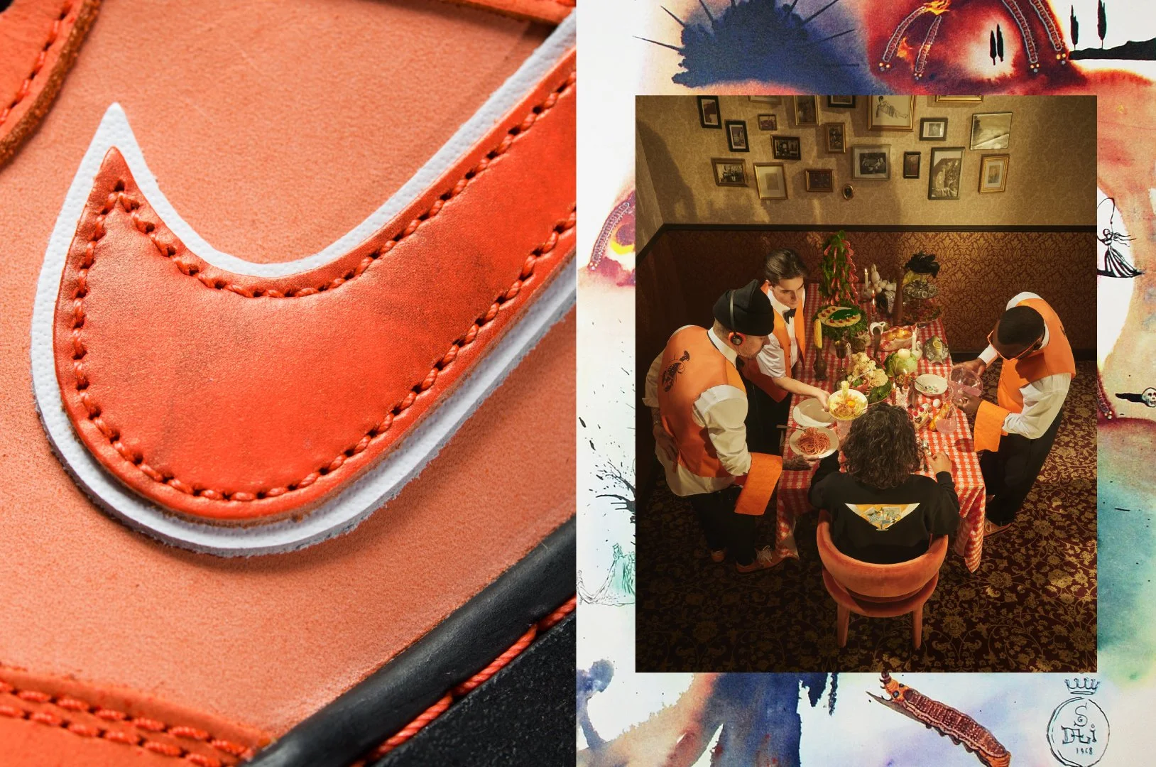 Our latest collaboration with Nike SB bridges the gap between art, fashion, luxury, and unconventional creativity. Adding a surrealist twist to the Lobster Dunk legacy, we drew inspiration from the world of Salvador Dali and his outlandish dinner parties that entertained guests with extravagant foods and settings that were a feast for the eye.